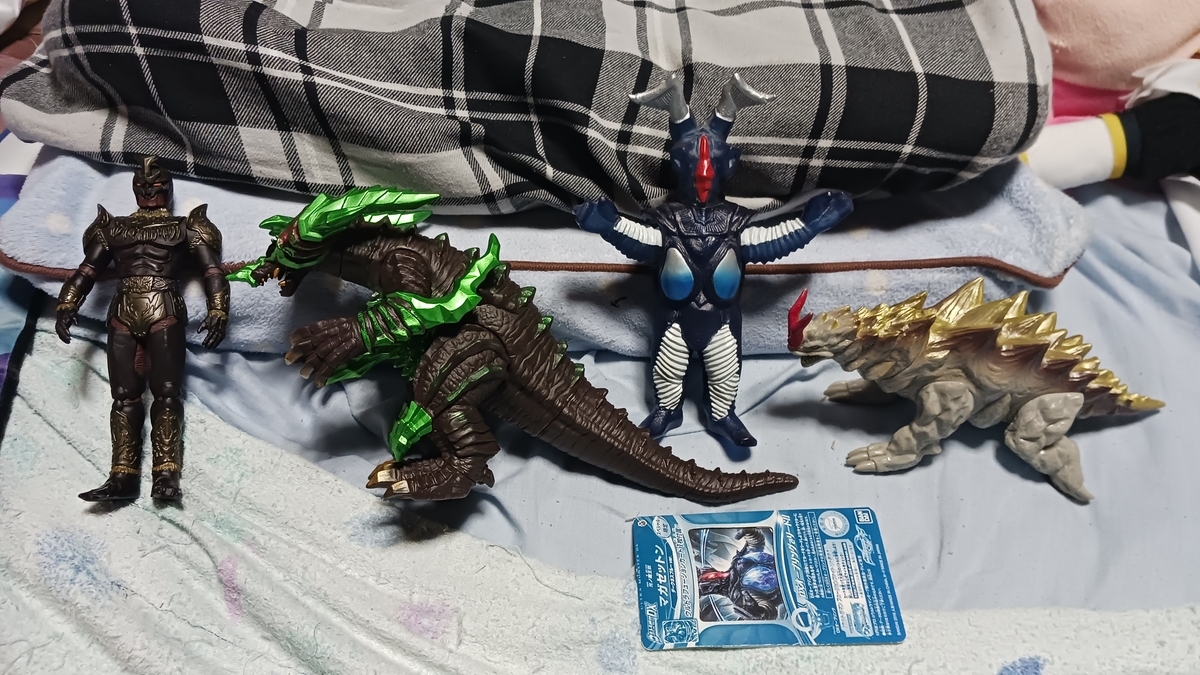 これは凄いぞ~。左から、仮面ライダークウガのゴ・ガドル・バ、大怪獣ラッシュのアースゴモラ、ウルトラマンオーブのマガゼットン、ウルトラマンティガのガクマβです!この中だと、マガゼットンが特にレアで、ウルフェス2016で限定販売されたコレクター泣かせの品です。しかもタグ付き(タグは最初から外れてました)です。これが何と2000円、ヤフオク等では9000円しますよ~。こんなものを入手するとは…早速今年の運を使い切ったか?そしてアースゴモラもマガゼットンと同じく狙ってた物で、2900円でした。しかもライブサイン付き!足の裏に値段らしき落書きがありますが、買えて良かったです。カッコいいですし。地味に大怪獣ラッシュのソフビは初めて買います。ガドルは900円と言う破格の値段で売ってたし、怪人なので購入。あまり詳しくないので説明は省きます。ガクマβは昔絵本でよく見た怪獣で、味があって良いので購入。いや~いい買い物だった!払ってもらったんだけど…。